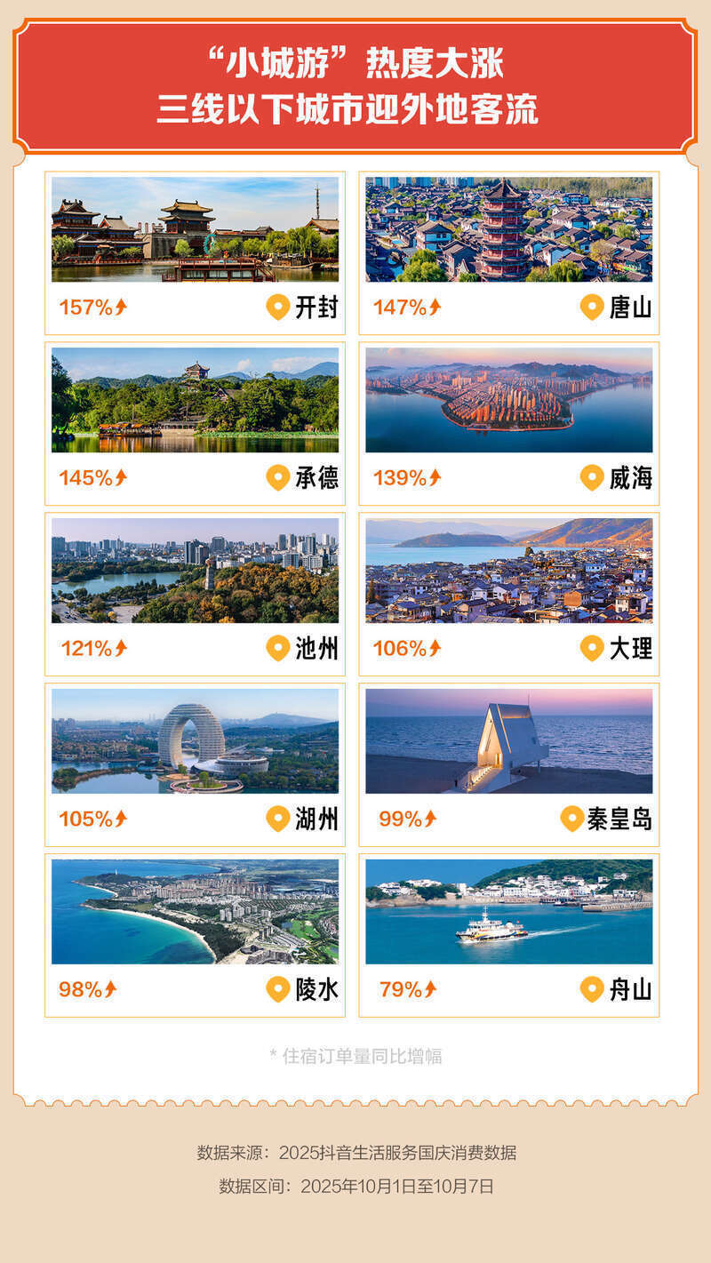 在出游目的地方面,平台数据显示,更具地方特色的小城颇受欢迎,当地住宿需求大幅增加。10月1日至10月7日,开封、唐山、承德平台住宿订单分别同比增长157%、147%、145%,威海、池州、大理、湖州均实现翻倍增长,秦皇岛、陵水、舟山也分别增长了99%、98%和79%。