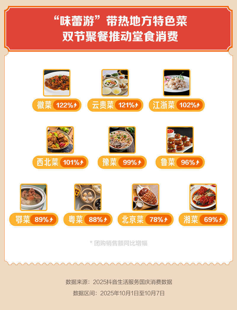 受国庆中秋双节8天超长假期推动,大众出游、购物休闲热情高涨,带动线下多类消费强劲增长。数据显示,国庆假期,地方菜抖音团购销售额同比增长76%,秋季饮品增长57%,住宿增长50%。
