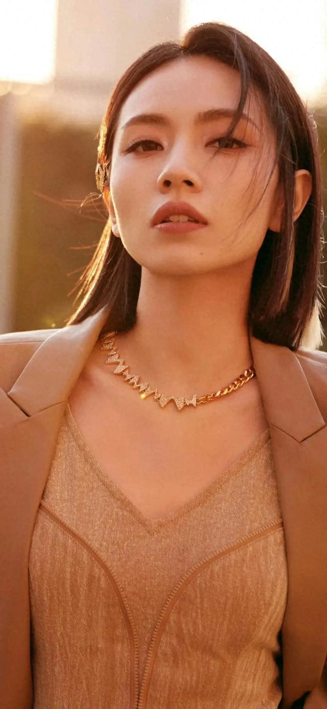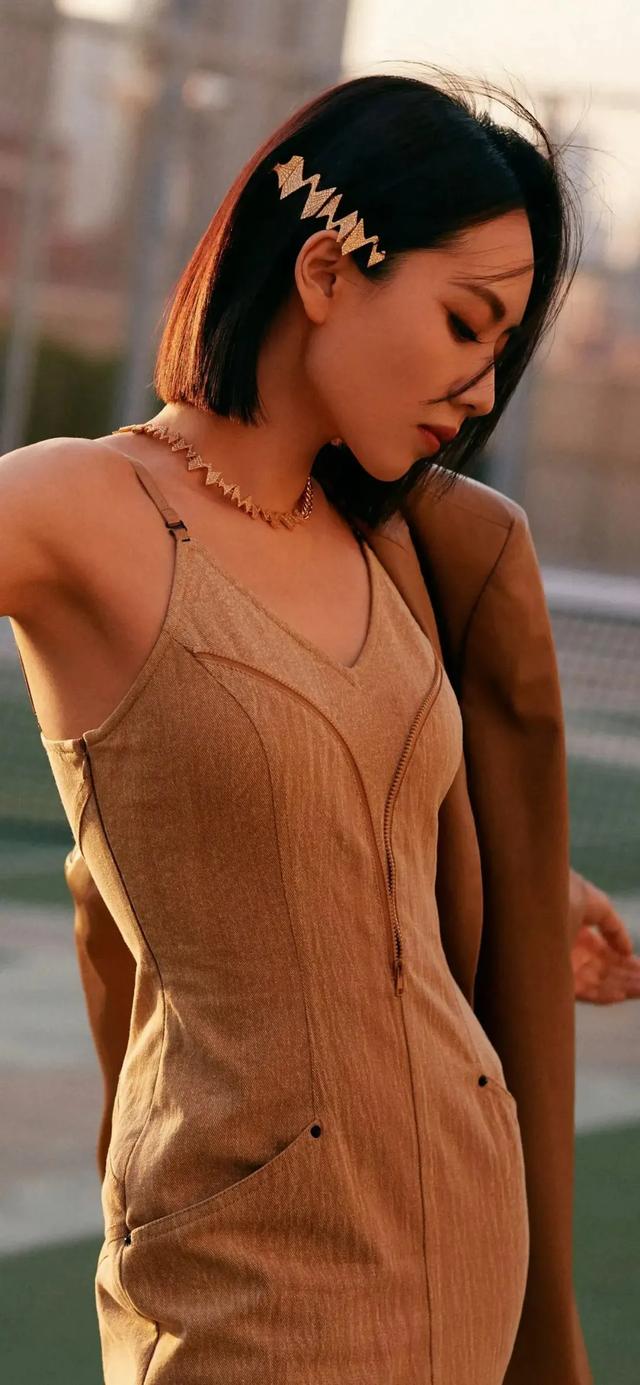 刘惜君身着暗黄极地长裙,在室外行走摆拍。夏季这种颜色是不讨好的,不过极其符合当日的天气。没有阳光的直射,这种暗黄的颜色就显得高端大气了。裸露的背,光滑且细腻。刘惜君的背线条是非常好看的。